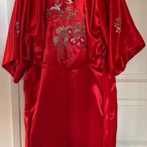 Indiskan pitkähkö kimono, koko L/XL. Materiaali viskoosia. Vaaleanpunainen (vanha roosa) väri, jossa kullanvärisiä kuvioita. Väljä leveä malli, leveät hihat ja vyö samalla kankaalla vyötärölle sitomista varten. Sopii käytettäväksi esimerkiksi kevyenä puserona tai kimonomaisena päällitakkina arkeen ja juhlaan.