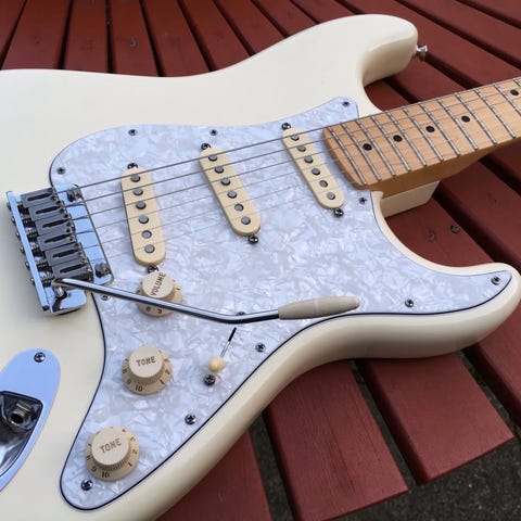 Ostin kitaran käytettynä kesäkuussa 2024 aloittaessani kitaraharrastusta. Alkuperäiselle ostajalle kitara on siirtynyt uutena alkuvuodesta 2024. Olen käyttänyt kitaraa säädätettävänä Raato Custom guitarsilla Keravalla ja se on erittäin kevyt soittaa. Nauhat on leveloitu ja kiillotettu, satula ja talla on säädetty. Kielisettinä tällä hetkellä 10-46. Nauhat on erinomaisessa kunnossa, ei kolhuja, mutta kevyttä käytönjälkeä plektrasuojassa. Tule testaamaan kitaraa Tuusulaan ja osta tästä itsellesi aito jenkkistrato.