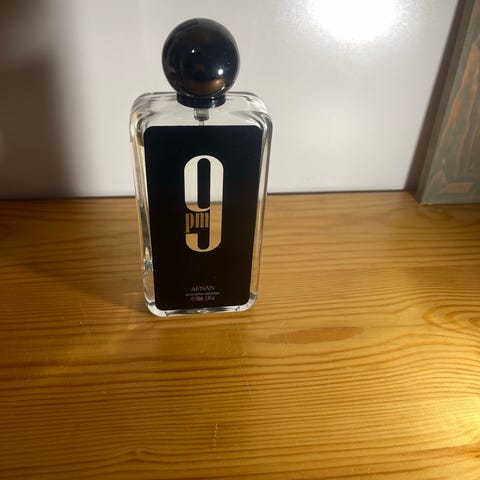 Afnan 9pm eau de parfum -hajuvesi. Pullon koko on 100 ml. Tuoksu on pakattu suorakulmaiseen lasipulloon, jossa on musta etupinta ja hopeinen numero 9 -koriste. Sopii yleiskäyttöiseksi eau de parfum -tuoksuksi.