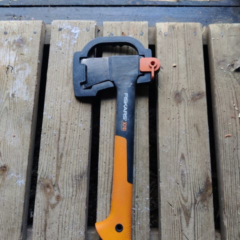 Fiskars X21 kirves. Kirveessä on musta-oranssi varsi ja muovinen teräsuoja. Soveltuu puun pilkkomiseen ja yleisiin puutöihin pihalla tai mökillä.