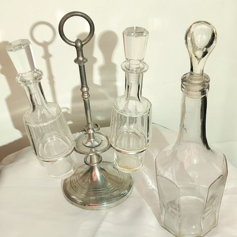 Lasipullot koristepulloina. Kaksi eriväristä pulloa: yksi kirkas ja yksi ruskea. Molemmissa on neliömäinen, litteä muoto ja kohokuvioitu koristeellinen pinta. Pullot sopivat esimerkiksi sisustuselementeiksi tai pienten nestemäärien säilytykseen. Materiaalina lasi.