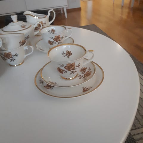 Kahvikuppisarja, jossa valkoista posliinia ja kullanväriset reunukset sekä koristekuviot. Sarjaan kuuluu 6 kpl kuppia, aluslautasiaa ja leipälautasta. Sopii kahvi- tai teehetkiin ja kattaukseen, jossa halutaan yhtenäinen posliinisarja. Klassinen väritys ja koristeet tekevät sarjasta perinteisen tyylisen astiaston osan.