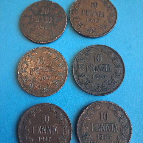5 pennin kuparikolikot vuosilta; 1913, 1914,