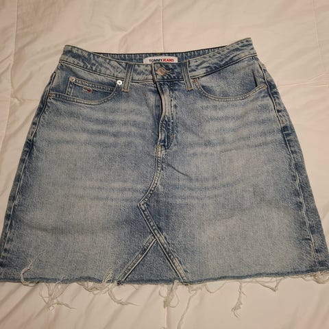 Korkeavyötäröisiä farkkuja kapealla lahkeella.
