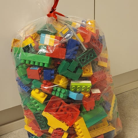 Lego Duplo rakennuspalikat ja hahmot, monivärinen setti. Mukana erilaisia suurikokoisia rakennuspalikoita, peruslevyjä, talon osia, ajoneuvojen osia sekä useita Duplo-hahmoja ja eläinfiguureja.