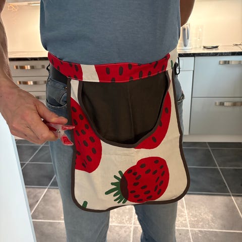 Uusi ommeltu pyykkipoikapussi, käsinpainettu hiiri kuva ja pyykkipoikia teksti.