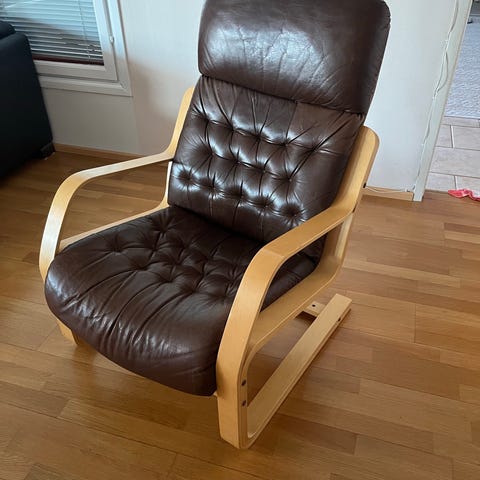 Nahkainen musta lepotuoli, jossa mekaaninen kallistus- ja jalkatukimekanismi sivussa olevalla vivulla. Tuolissa on pehmustetut käsinojat, korkea selkänoja ja pyörivä jalusta. Sopii olohuoneeseen tai muuhun oleskelutilaan istuma- ja lepoasentoon.