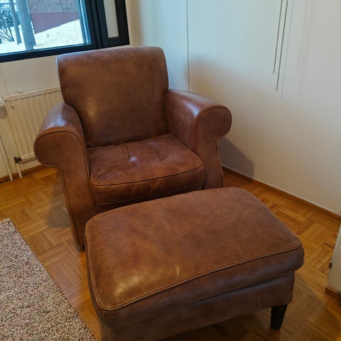 Myydään noin kaksi vuotta vanha ”korsiteeksi”, jäänyt BUG -nojatuoli korkealla selkänojalla. Nahkaverhoilu konjakin värissä.