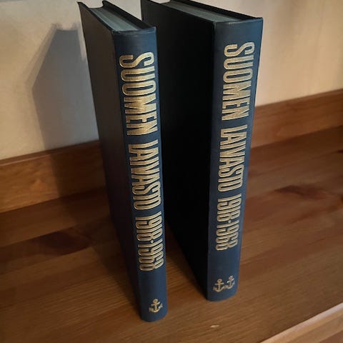 Myyn kuvissa näkyvän Suomen laivasto sodassa 1939-1945 kirjan vuodelta 1991. Tämä kirja kertoo kuvin ja sanoin toisen maailmansodan aikaisen Suomen laivaston tarinan. Sivuja on 168 ja kirja on kovakantinen. Ilmeisesti tästä kirjasta on aikoinaan otettu vain pieni painosmäärä, kun eräs tunnettu alan myyjä pyytää samnlaisesta opuksesta peräti 100 euroa. MInulla on näitä kirjoja kaksi ja pidän sitten tuon kirjaston poistaman kirjan omassa hyllyssäni. Tämä myytävänä oleva kirja on siis hyvässä kunnossa. Taisin ostaa opuksen heti sen ilmestyttyä aikoinaan. Osa kuvistani on siitä kirjaston kirjasta, joka ei mennyt kaupan. Olen taas hankkinut Sulo Vileeninä enemmän uusia kirjoja kuin myynyt vanhoja poies alta. Joudun kesällä duunaamaan uuden kirjahyllyn... Postikulut tälle ylimääräiselle kirjalle 8.90 euroa. Samoilla posteilla tulee useampikin opus. Postittelen täältä periferiasta pari kertaa viikossa, kun postitoimipaikat ovat kaukana.