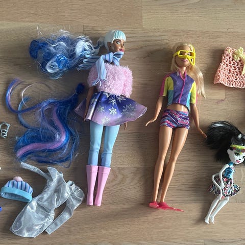 Ehjä Barbie, aurinkolasien toinen sanka katkennut ja toisen hihan sauma ratkennut, muuten hyväkuntoinen setti. Postitus lisähintaan.