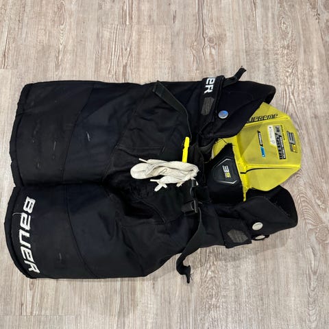 Myydään ehjät ja siistit prohousut, koko jr L/ 155-165cm, sopii parhaiten max 160cm pelurille. Housun suuaukossa mahan kohdalla kulumaa rintapanssarin hankauksesta. Nouto, toimitus Kajaanin jäähallille tai postitus ostajan piikkiin.