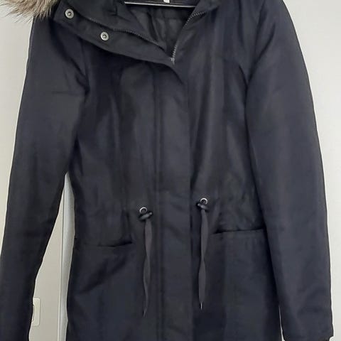 Hupussa irroitettava karvareunus, vyötäröllä kiristysnauha.