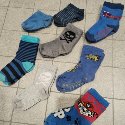 Sinisiä sukkia muutamia kertoja käytetty, muuten käyttämättömät kun olivat jo liian pienet. Kokomerkintä puuttuu mutta vastaavat noin kokoa 24/26. Pehmeät ja paksuhkot.