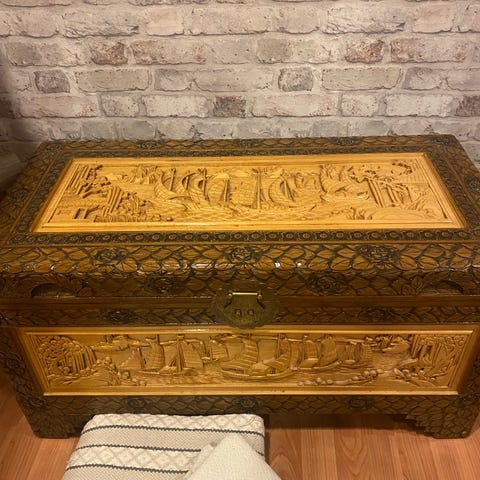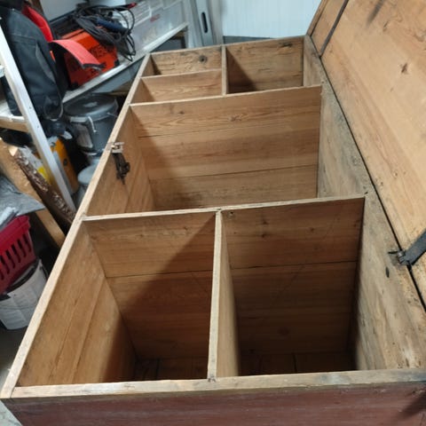 Puinen kaarikansiarkku metallivahvikkein. Ulkopinta on tummanruskea ja vahvistettu vihertävillä metallivöillä ja -kulmilla. Arkussa on etupuolella metalliset kantokahvat ja lukituslenkki riippulukolle. Sisäpuoli on vaalea ja jaettu kahteen osaan kiinteällä väliseinällä. Sopii esimerkiksi säilytysarkuksi tekstiileille, leluille tai muille tavaroille sekä sisustuselementiksi.mitat l:66cm,s:50cm,k:48cm.Toinen sivukahva puuttuu,parista kohtaa lista repsottaa.