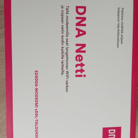 Pari vuotta käyttössä ollut DNA modeemi. Laatikko kärsinyt, mutta modeemi ja piuhat moitteettomassa kunnossa.