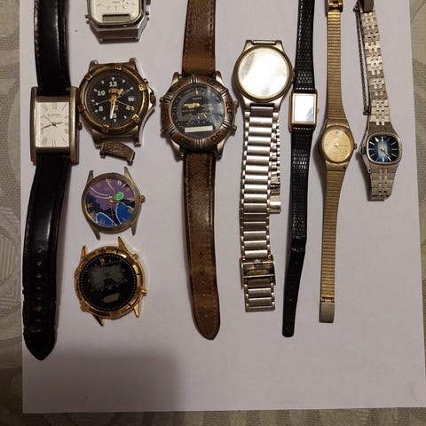 2 herätyskellon, Mauthe vuodelta 68 ( toimii), Kienzlr vuodelta 57, jousi poikki. 2 miesten Leijona kelloa n 60 luvulta, 3 naisten kelloa Avia, Inex ja Zenith. Lisäksi 5 halpis-kelloa. Kunnosta en tiedä, paitsi tuo yksi vekkari alkoi käymään, kun vedin sen.