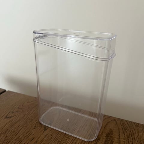 Mitat 20x15x8.5cm, eli normaalikokoinen kahvipaketti (500g) mahtuu. Tässä säilytetty kahvia ja teetä. Siistikuntoinen ja ehjä, mutta joitain käytön jälkiä näkyy tarkkaan katsomalla. Tiskattu, mutta siitä huolimatta kahvin/teen tuoksu.