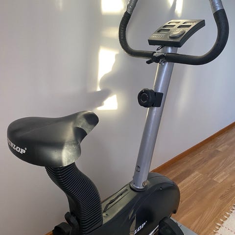 Atlas kuntopyörä sisäharjoitteluun. Laitteessa on säädettävä satula ja polkimet hihnoilla. Harmaa runko, Käytettynä hankittu ja käyttämättä jäi. Yhdestänurkasta puuttuu muovi jalkatuppi. Näkyy kuvassa.
