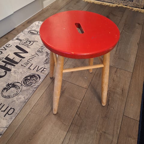 Täyspuinen jakkara. Täysin ehjä ja tukeva istua, mutta lakkapinta jaloista paikoitellen kulunut (näkyy kuvissa). Päällystetty uudelleen muutama vuosi sitten. Helppo päällystää uudelleen. Päällisessä yksi himmeä tahra, joka näkyy kuvassa 4. Istuin hieman leveämpi ja korkeampi toiselta puolelta. Hintapyyntö 45€. Vain nouto Helsingin Käpylästä. Toridiili ei ole käytössä, ethän tarjoa sitä.
