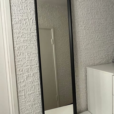 IKEA seinäpeili mustalla kehyksellä. Kapea ja korkea malli, sopii esimerkiksi eteiseen tai makuuhuoneeseen kokovartalopeiliksi. Peili kiinnitetään seinään. Väri: musta kehys.
