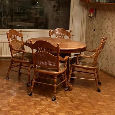 Pyöreä ruokapöytä sekä neljä tuolia (kuvassa näkyy vain kolme)