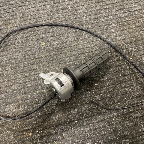 Yleisilmeeltään siisti ja toimiva suzuki pv kaasukahvarunko. Puhdistin sammusnapin metalliosat, joten sähkö varmasti kulkee. Halutessasi voin tinata uuden mustan johdon sammutusnappiin kiinni. Miinuksena kahvarungon alaosasta lohkennut pienet palat pois molempien kiinnitysreikien kohdalta. Ei ole muuta, kuin kosmeettista haittaa ja pultin kannat peittää varsin hyvin jäljet. Itse runko on ehjä.
