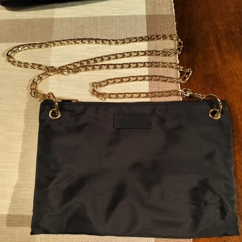 Musta pikkulaukku. Daniel Ray. Leveys 20 cm, korkeus 10 cm. Pohjan syvyys 2,5 cm. HIHNA kiinteä ja päädystä päätyyn 55 cm.