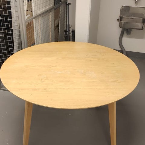 Annetaan viilupintainen tammipöytä. Siirretty ulos pari päivää sitten odottamaan kuljetusta