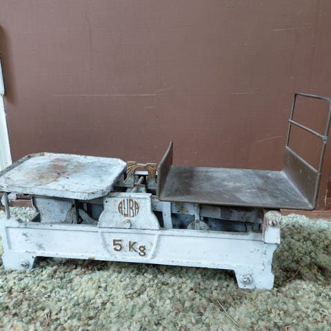 Aivan ihana valurautainen talousvaaka. Peltilautanen ja viisari puuttuu. Taulu emailoitu ja hienossa kunnossa. Tod. Näk. 1920- luvulta. Painaa 2 kg. Korkeus 29 cm leveys 21 cm. Nouto Kirkkonummen Luomasta.