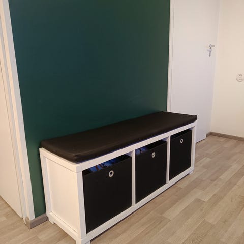 Jämerä metallirunkoinen penkki kahdella säilytyslaatikolla, kestää istumista. Istuimen korkeus 50 ja kokonaiskorkeus 60.