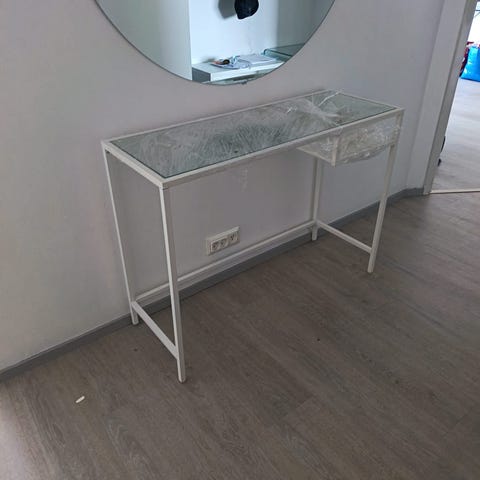 Konsolipöytä. Messinki runko ja marmorimainen lasi. 2 kerrosta. Kaunis sisustuksesa. Kuin uusi eikä käytön jälkiä.