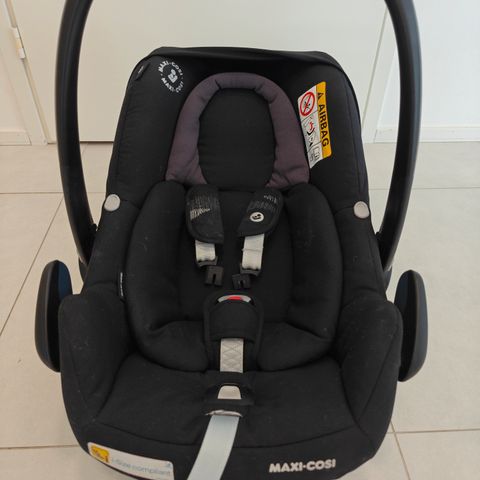 Maxi-Cosi turvakaukalo, kolaroimaton, siistissä kunnossa. Väri tummanharmaa. Turvakaukalossa on kolmipistevaljaat ja pehmustettu vauvatuki vastasyntyneelle, olkahihnoille kaksi eri korkeutta. Soveltuu noin 75 cm pituuteen asti, painorajat 0-13 kg. Asennus selkä menosuuntaan joko auton turvavöillä tai erillisellä telakalla. Saa erillisillä adaptereilla kiinni useisiin eri mallisiin rattaisiin. Käyttöohjeet mukaan.