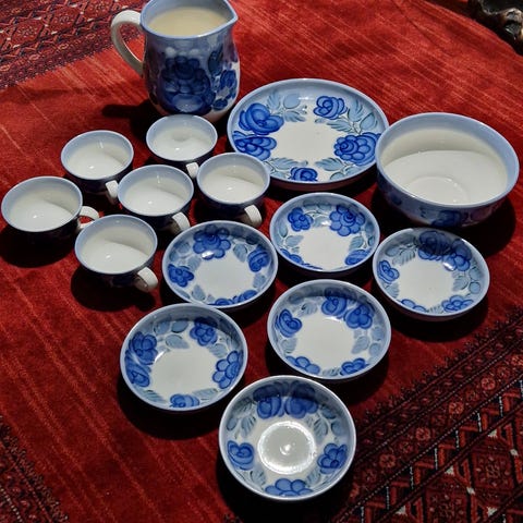 Upea tsekkiläinen posliiniastiasto kuudelle hengelle. Kaunis kuviointi ja kaikki astiat ehjiä. Hyviä isoja tarjoiluvateja ja kulhoja ruokailusetin lisäksi. Keittokulho ja sievä kannukin. Tämä setti on kerrassaan ihastuttava.