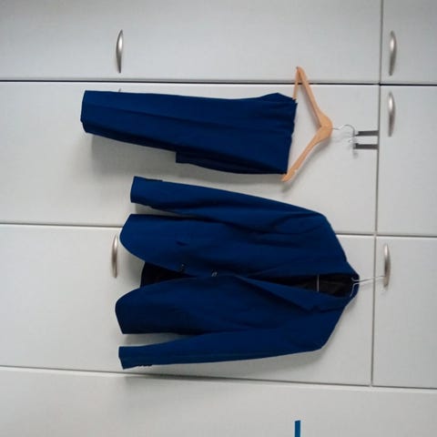 Lindbergh White slim fit -miesten puku sinisenä, koko EU 48. Pukuun kuuluu kaksinappinen pikkutakki ja suorat housut. Takissa lovikäänteet, etutaskut läpillä sekä rintatasku. Hihansuissa neljä nappia. Housuissa vetoketju- ja nappikiinnitys sekä vyölenkit. Malli on slim fit eli kapealinjainen.