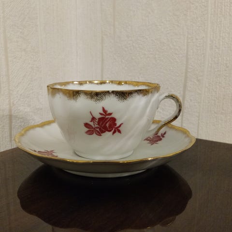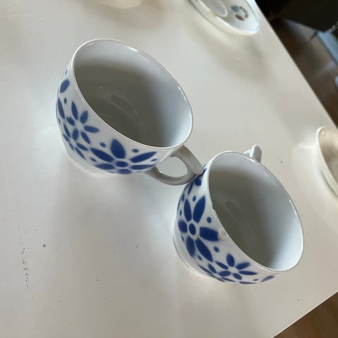 Myyntiin 9kpl (kahvikuppi + asetin) Arabian Greta-Lisa Jäderholmin suunnittelemaa OB-mallin settiä. Lisäksi yksi setti, josta pieni pala lohjennut sekä kupista että lautasesta. Mukaan myös yksi ylimääräinen lautanen.