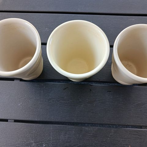 Valkoiseksi lasitetut punotut keraamiset kukkaruukut (vaativat sisäruukun), koko 10 x 10 x 10 cm. Nouto Töölö tai Munkkiniemi.