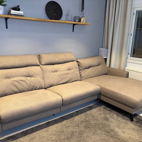 Väri beige/harmaa. Sohvan päällysteet saa irrotettua ja pestyä hyvin. Sohvan istuintyynyt ovat erinomaiset istuessa ettet valuu alas🫠