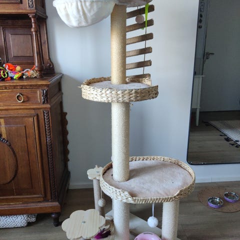 Korkea harmaa raapimispuu kissoille. Useita tasoja, ylhäällä pyöreä peti pehmusteella sekä alempana riippuva peti. Pylväissä on sisalpintaa kynsien teroittamista varten ja rakenteessa roikkuva köysi leikkeihin. Soveltuu kissan kiipeilyyn, leikkiin ja lepoon sisätiloissa. Yhdessä yläpedissä näkyy kulumaa kankaassa ja reunassa.