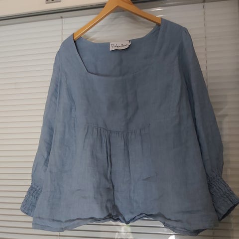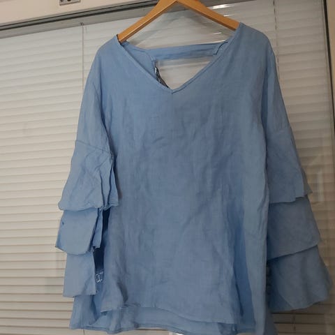 Ihana ja ilmava Bohemiana-merkin pellavapaita. Malli on oversize ja laskeutuu kauniisti. Lyhyet pussimaiset hihat, joissa rypytys. Takana pieni nappikiinnitys. Sopii täydellisesti kesään, kerrospukeutumiseen tai boho-tyyliin.