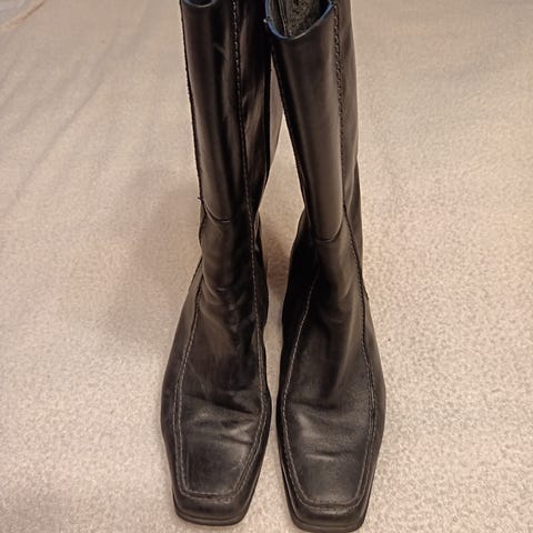 Hyväkuntoiset nahkakengät. Koko 6 1/2,vastaa 39-40. Sisäpituus 26cm,korko n.6cm.Sivussa vetoketju. Uudet korkolaput vaihdettu. Varsi kantapäästä mitattuna 25cm. Lähetys myös ilman diiliä.