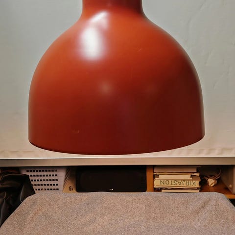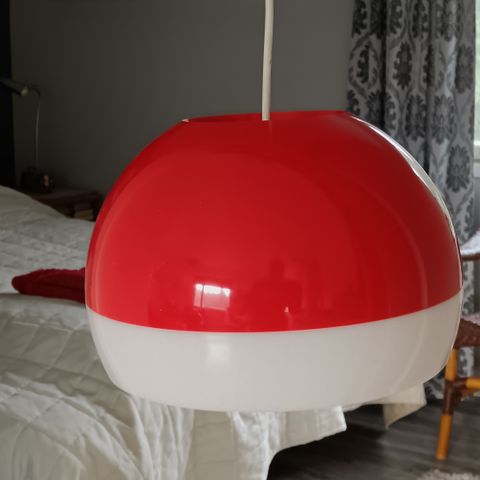 Tanskalainen harvinainen designvalaisin 60-luvulta. Halkaisija 37 cm. Valaisimesta saa alumiinikehikon pois, jolloin voi käyttää vain opaalilasista kupua. Johdossa ei ole liitintä mukana eli pitää lisätä joko pistoke tai sokeripala kiinnitystavan mukaan