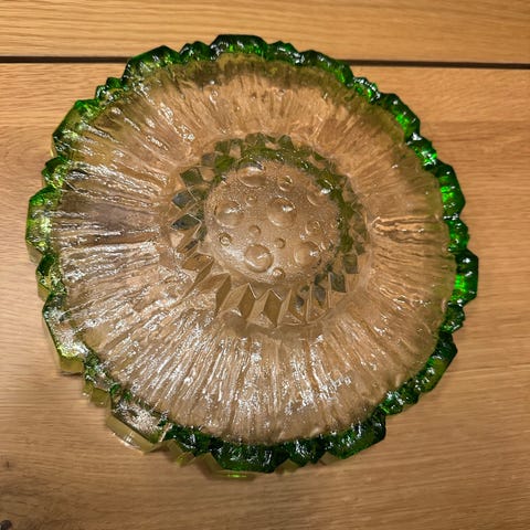 Pertti Santalahden Humppilan lasille suunnittelema tarjoiluastia. Pohjassa kaiverrukset.