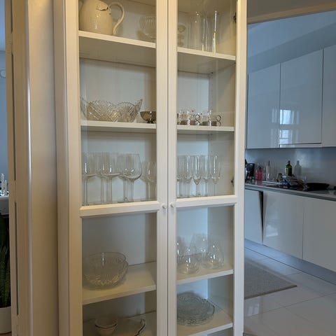 Myydään hyväkuntoinen valkoinen Ikean Billy hyllykkö vitriini-ovineen.
