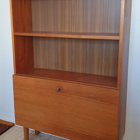 Toisen hyllyn taustalevy on tiikkiviilua, toisen puunjäljitelmälevyä. Hyllyissä on iän mukaisia naarmuja, kolhuja ja käytönjälkiä.