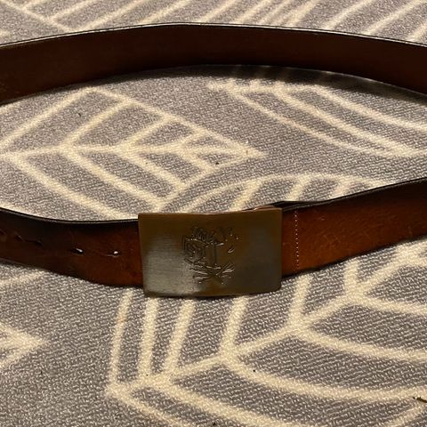 Hieno, aidosta nahasta punottu niittivyö. Pehmeä, hyvälaatuinen nahka on pohjaväriltään vaaleanruskea, tummempia ruskeasävyjä paikoitellen. Teräsniitit. Vyön pituus 88-92 cm.