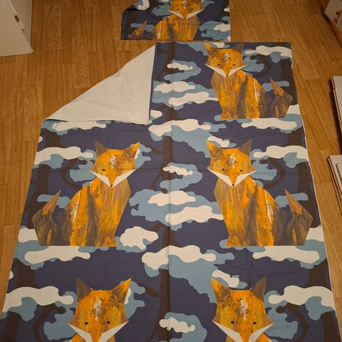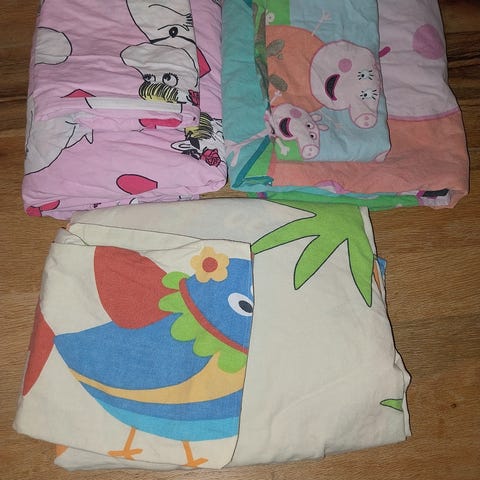 Ti-ti nalle lasten koon 120x160 pussilakana ja noin 40x55cm tyynyliina. Pussilakanan toisella puolella muu kangas. Tyynyliinassa puolet erilaiset. Vanha on, mutta ikäänsä nähden suhteellisen siiti. 10e.