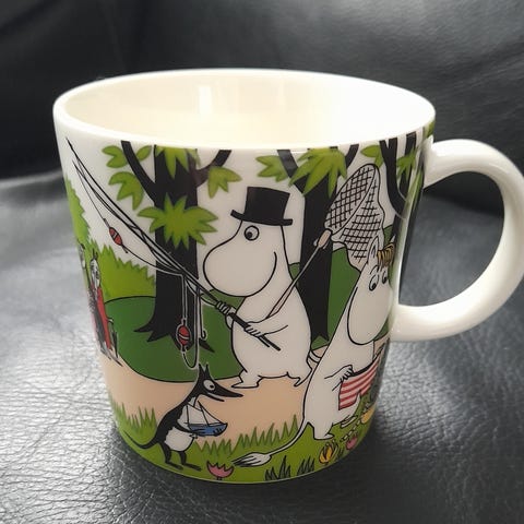 Täysin uusi ja käyttämätön muumimuki "iltauinti". Tarra kiinni.