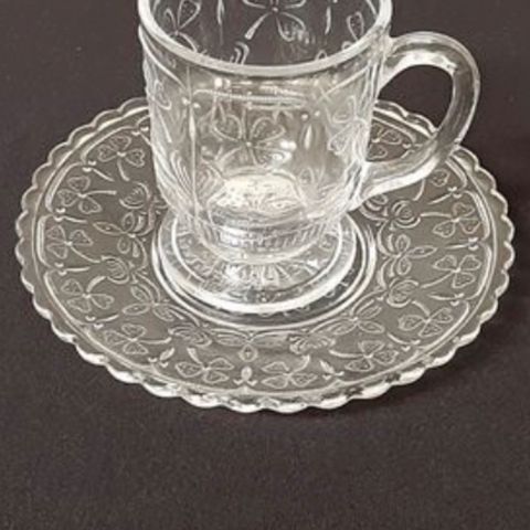 Nuutajärven lasisia Apila-kahvikuppeja alulautasineen, kakkulautasia ja kermakko: