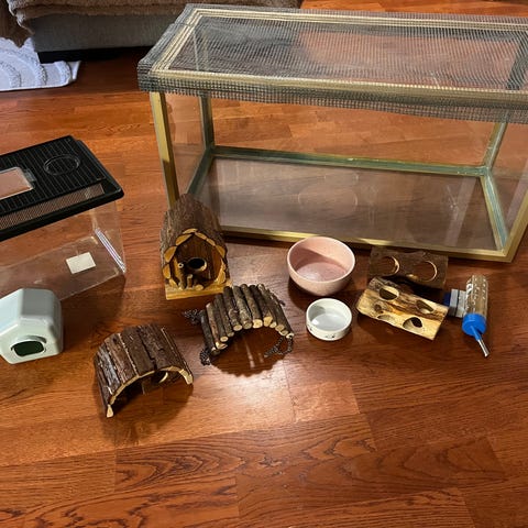 kääpöhamsterin terraario ja kantohäkki tarvikkeineen.