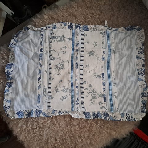 Puuvillaa. Voi pestä. Liinojen leveys on 50 cm ja korkeus 60 cm. Vetoketjuilla.
